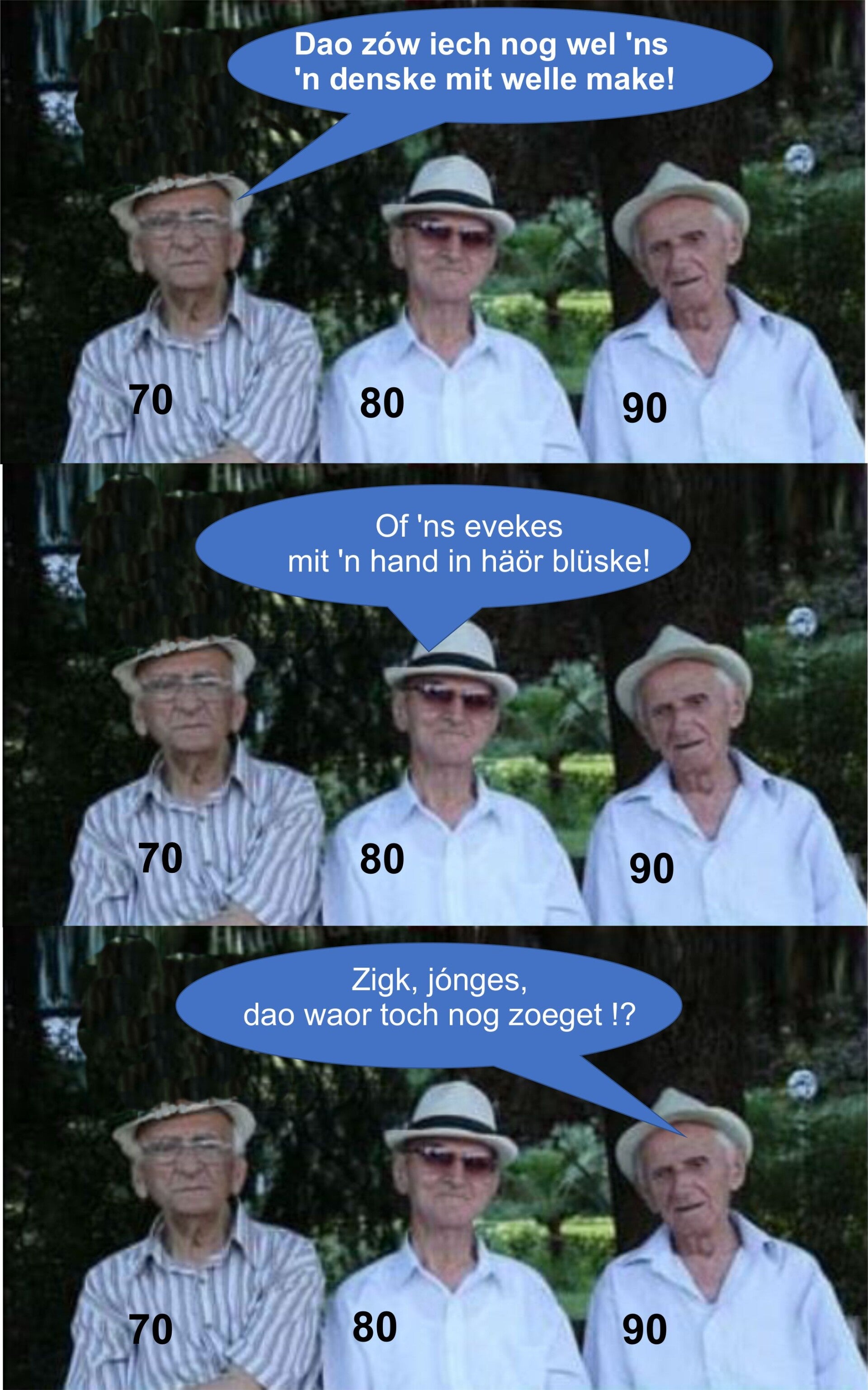 en went ze 't kink al óp de rugk kieke, mómpelt dèe va neuëgetig: "Zigk, jónges, dao waor toch nog zoeget!?"